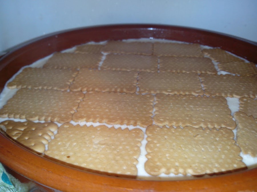Echamos el caramelo en un molde y lo repartimos bien por el fondo. Encima del caramelo vertemos la mezcla de todos los ingredientes y colocamos unas galletas para luego hacer de base.