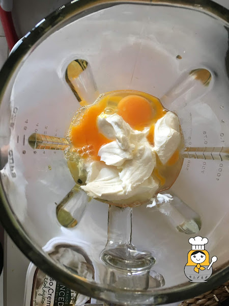 Batimos los huevos junto con el azúcar y el queso crema. Añadimos la leche y volvemos a batir hasta que se mezclen bien todos los ingredientes.
