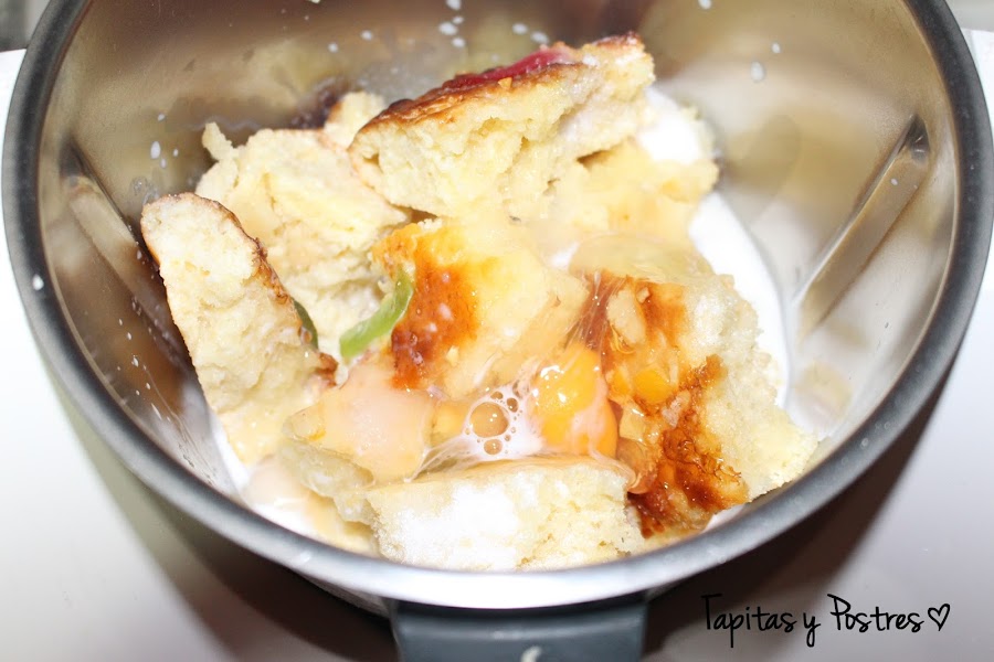Ponemos en el vaso de la thermomix o de la batidora el roscón troceado, el azúcar, los huevos y la leche. Dejamos cinco minutos que el roscón se empape de la leche y trituramos 30 segundos a velocidad 8, hasta que quede completamente deshecho todo.