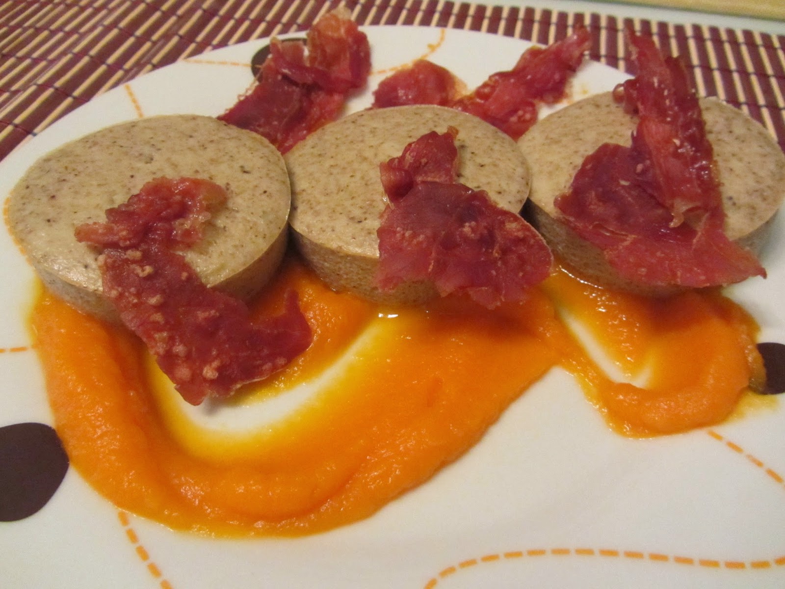 Encender el horno a 180º y preparar unas flaneras de silicona al baño María. En una sartén ponemos 2 ct de aceite y pochamos la cebolla y las setas. En un vaso de batidora, ponemos los huevos, la nata (crema de leche), el vino y el sofrito de cebolla y setas. Salpimentar y triturar. Rellenar las flaneras y hornear al baño Maria durante 30 min. Mientras se cocina, pelamos y troceamos la calabaza. En un recipiente apto, papillote o similar cocinamos la calabaza con un poco de agua durante 15 min. Sacamos la calabaza y trituramos para obtener una puré espeso. Cojemos el jamón y entre 2 hojas de papel de horno lo extendemos y secamos en el microondas por tandas de 30 seg. Sacamos nuestros flanes del horno, desmoldamos y emplatamos con un cono de puré de calabaza acompañado del crujiente de jamón y nuestros flanecitos de setas.