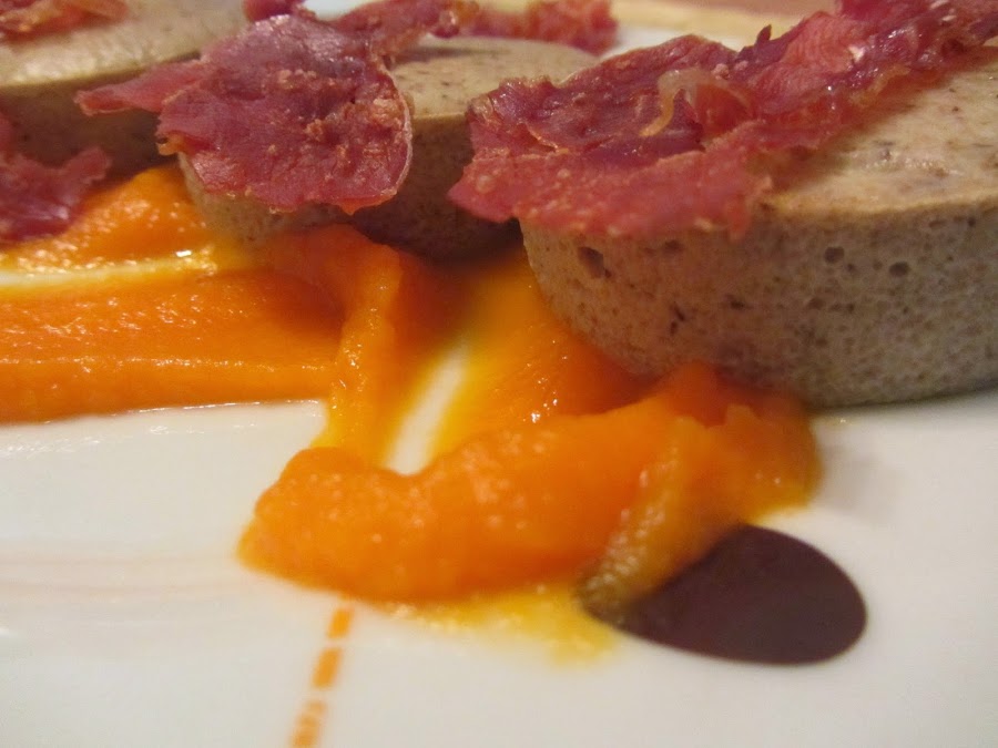 Encender el horno a 180º y preparar unas flaneras de silicona al baño María. En una sartén ponemos 2 ct de aceite y pochamos la cebolla y las setas. En un vaso de batidora, ponemos los huevos, la nata (crema de leche), el vino y el sofrito de cebolla y setas. Salpimentar y triturar. Rellenar las flaneras y hornear al baño Maria durante 30 min. Mientras se cocina, pelamos y troceamos la calabaza. En un recipiente apto, papillote o similar cocinamos la calabaza con un poco de agua durante 15 min. Sacamos la calabaza y trituramos para obtener una puré espeso. Cojemos el jamón y entre 2 hojas de papel de horno lo extendemos y secamos en el microondas por tandas de 30 seg. Sacamos nuestros flanes del horno, desmoldamos y emplatamos con un cono de puré de calabaza acompañado del crujiente de jamón y nuestros flanecitos de setas.