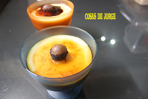 Dejamos cuajar, colocamos una cucharada sopera de azúcar en el centro de cada copa y quémanos el azúcar con el soplete de cocina.