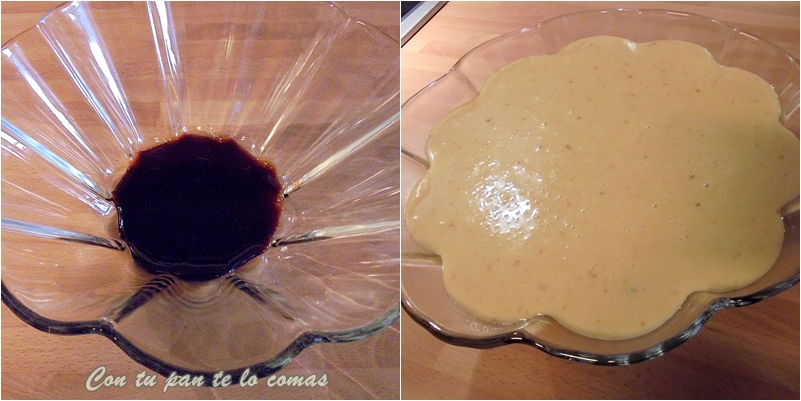 3. Caramelizar el fondo de un molde de flan y echar la mezcla con cuidado para que no se mezcle con el caramelo.