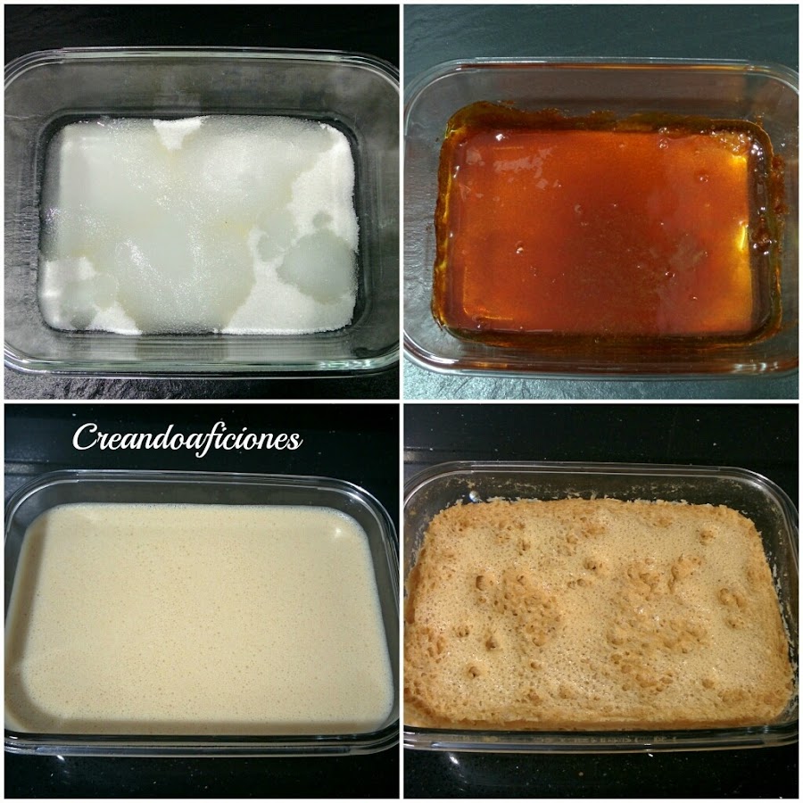 Ponemos la mezcla encima del caramelo y lo metemos en el microondas a máxima potencia 6 minutos, pinchamos con un palillo y en este caso tener cuidado, ya que parece que la mezcla cuaja pronto y se queda un poco seca, última foto del collage de cuatro, por lo que al pinchar con el palillo si queda algún trocito pegado seco, es en ese momento cuando ya estaría listo. Si hace falta que se haga un poco más, poner de pocos en pocos segundos e ir pinchando.