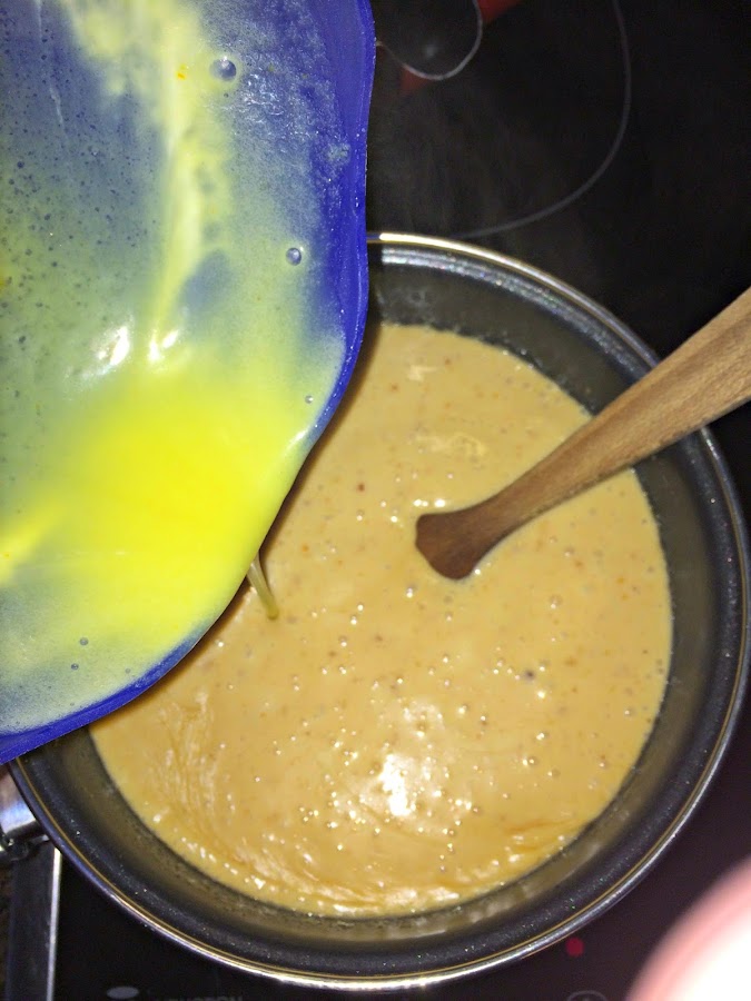 Cuando la nata (crema de leche) con el turrón que tenemos al fuego comience a hervir, vamos a añadir la mezcla del bol sin parar de remover, para que se integren bien los ingredientes y no se peguen en el cazo. Removeremos sin parar hasta que el preparado comience a hervir de nuevo, veremos que espesará bastante deprisa, por eso no hay que parar de remover. En el momento que comience a hervir lo apagamos y lo dejamos templar en el cazo. Mientras vamos a preparar el molde.