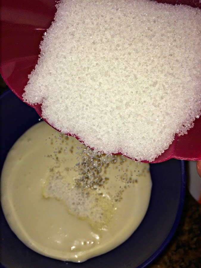 Mientras se mezcla el turrón con la nata (crema de leche), en un bol vamos a poner el vasito de nata (crema de leche) que habíamos reservado, la leche, el azúcar y el sobre de preparado para flan. Lo removemos bien para que se mezclen los ingredientes y el preparado para flan se disuelva sin hacer grumos.