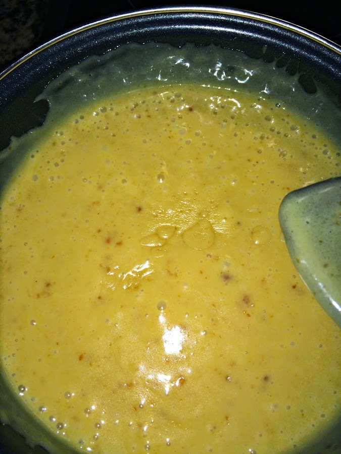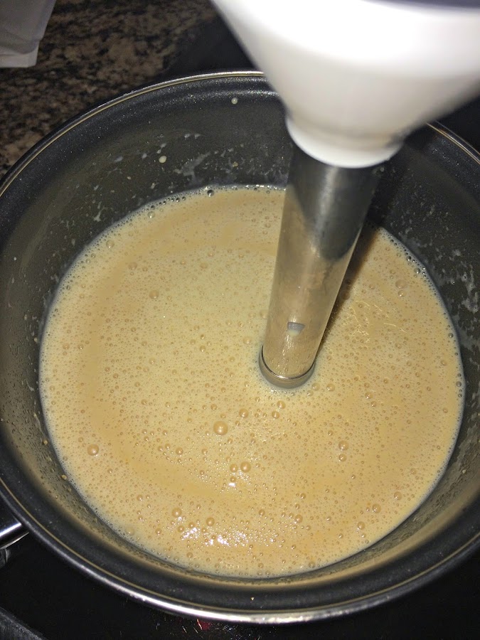 Comenzamos separando un vasito de la nata (crema de leche), y poniendo el resto en un cazo al fuego. Deshacemos el turrón y lo añadimos al cazo, lo iremos removiendo para que el turrón se deshaga con el calor de la nata (crema de leche). Si no nos apetece encontrarnos en el flan los trocitos de almendra, podemos pasar la batidora, así también se deshará mejor el turrón.