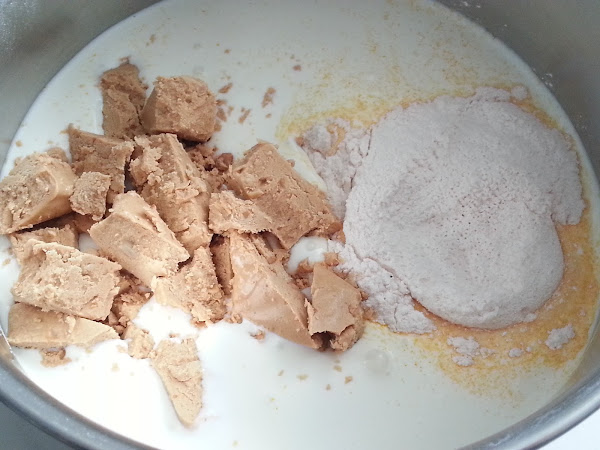 1. - Ponemos en una cacerola la nata (crema de leche) con el flan y el turrón troceado.
