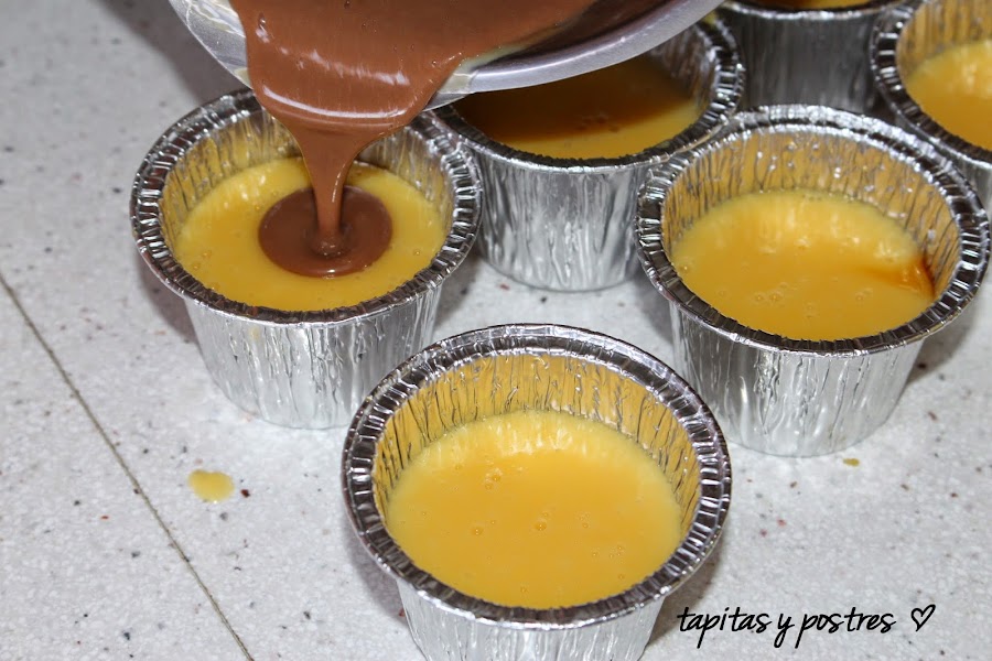 Este es mi intento de hacer un flan de dos colores. Eché sobre algunos un poco de flan de chocolate, para ver si salían dos colores. Pero no.