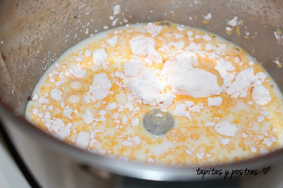 Echamos la leche, el azúcar y el sobre de flan y programamos 7 minutos, 90º, velocidad 4.