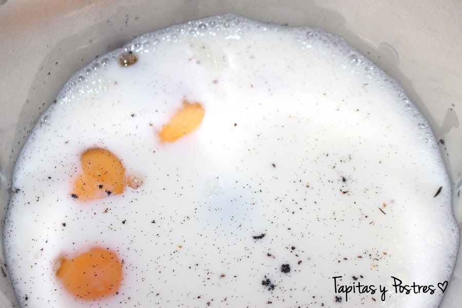 Ponemos en el vaso de la thermomix la leche, los huevos, el azúcar y las semillas de la vaina de vainilla o el azúcar vainilllado. Mezclamos bien 20 segundos a velocidad 4. Esto lo podemos hacer con una batidora eléctrica. Vertemos la mezcla en los moldes con caramelo, pero tened en cuenta que si usáis vainilla natural deberemos pasar la mezcla por un colador fino para que no se nos cuelen las semillitas.