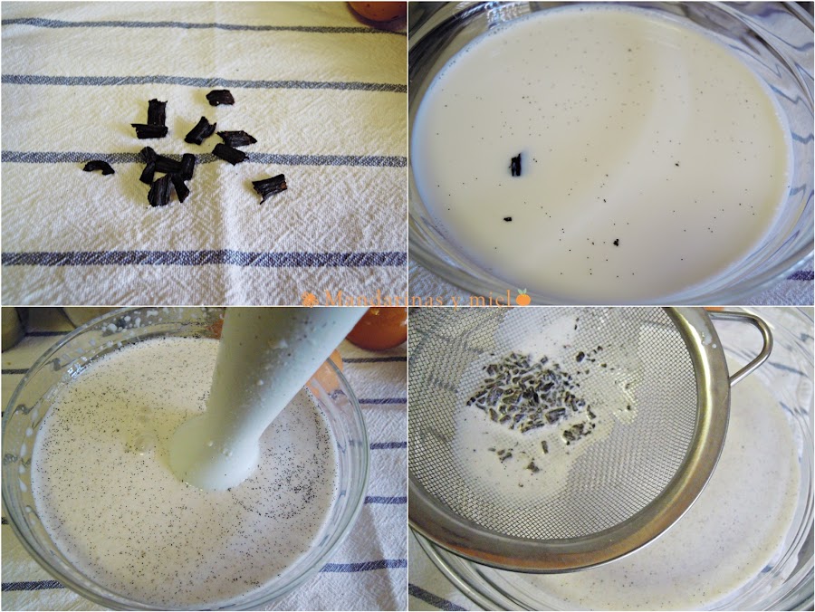 Cuela la leche con un colador fino. No tires los trocitos de vainilla, deja que se sequen y guárdalos para otra ocasión.