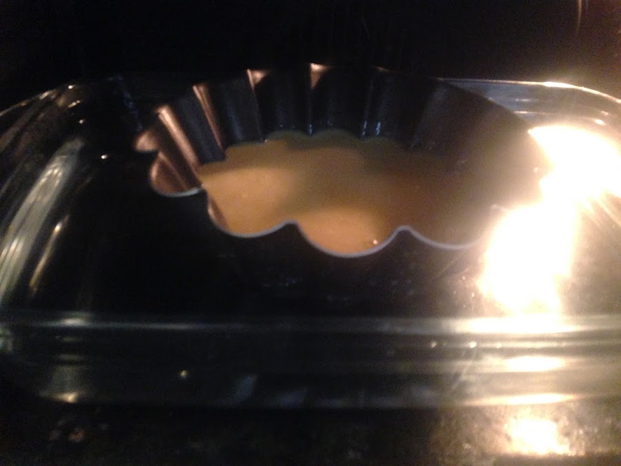 Cogeremos un molde y lo caramelizamos, vertiremos la mezcla y lo pondremos al baño María en el horno, que previamente abremos calentado a 200º. Modo arriba y abajo.