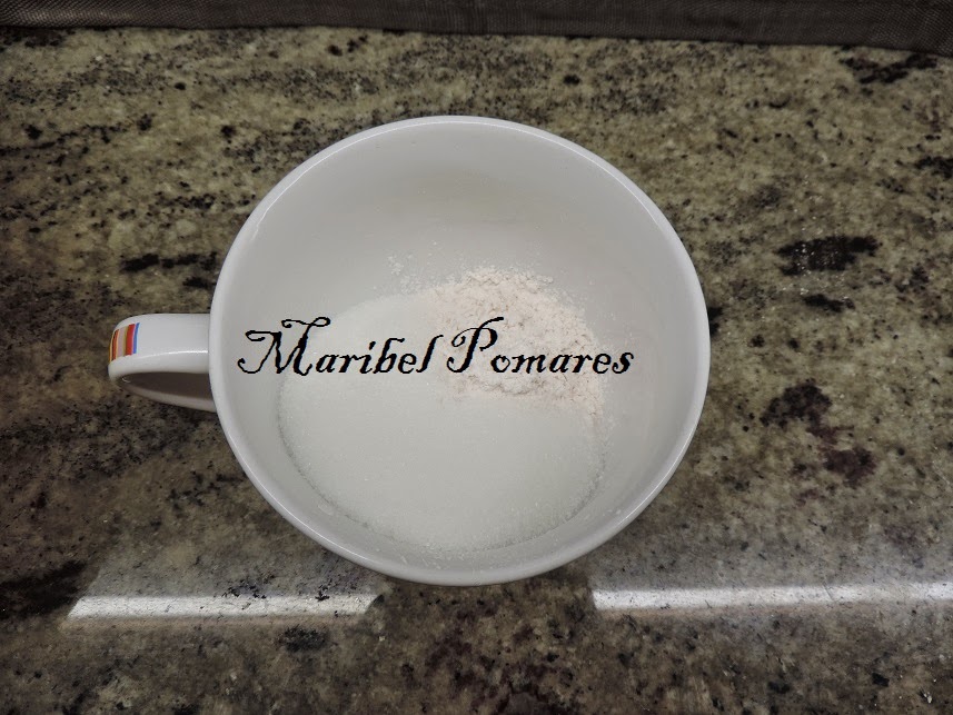 En una taza ponemos el sobre de flan del niño y el azúcar.