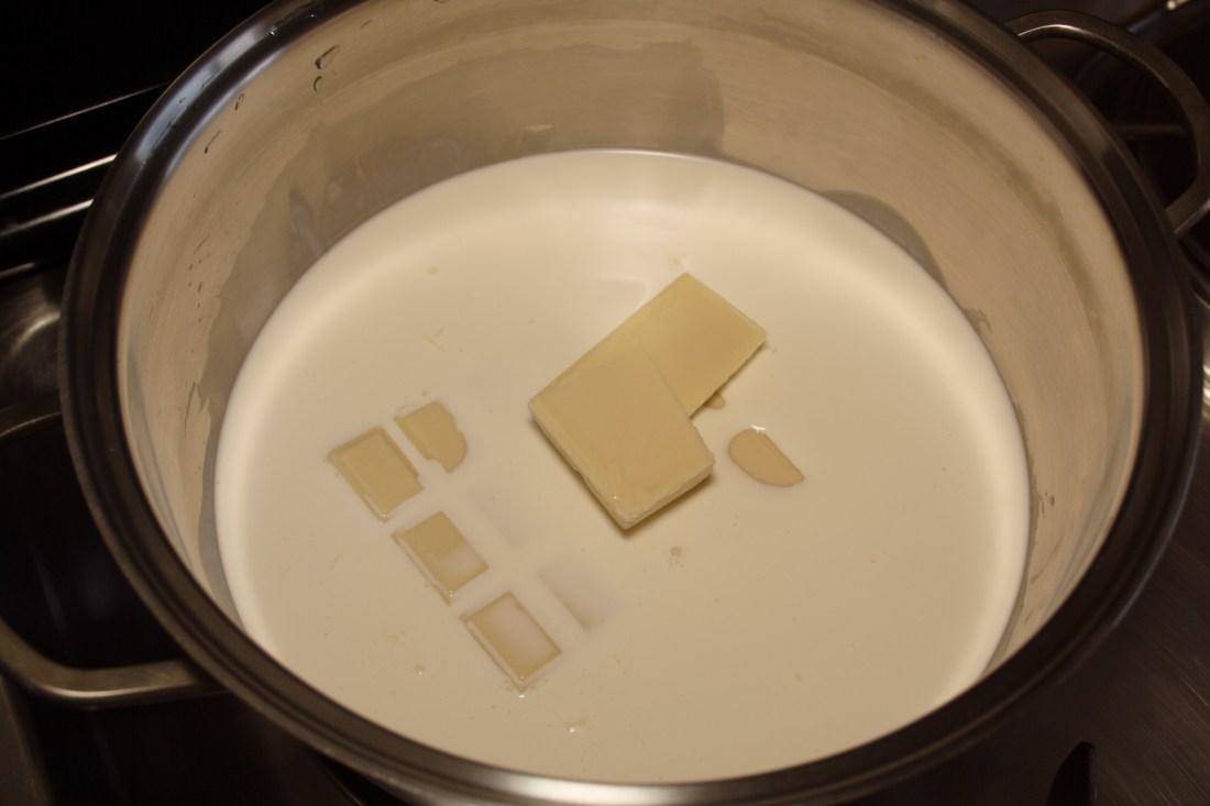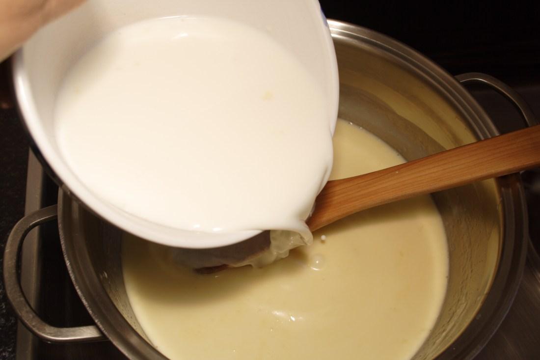 En una cazuela mezclamos 250 ml de nata (crema de leche), los 100 gr de chocolate blanco, llevamos al fuego hasta que hierva y se funda el chocolate, removiendo, retiramos y vertemos la mezcla de la leche y la cuajada. Llevamos al fuego de nuevo, removemos bien y constantemente hasta que vuelva a hervir.