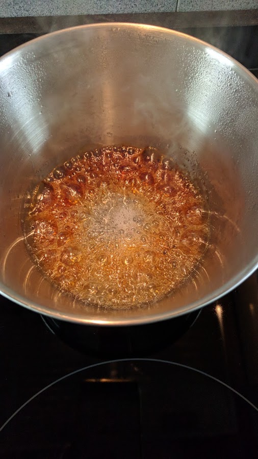 Esta parte es idéntica en ambos casos. Si tú placa es de inducción podrás preparar el caramelo directamente en la flanera. En caso contrario hazlo en un recipiente adecuado y luego lo pasas a la flanera. También puedes hacerlo en el microondas, poniendo a máxima potencia. En cuanto empiece a caramelizar saca en seguida (yo lo voy poniendo de 2 en 2 minutos hasta que veo que casi está; luego controlo continuamente)