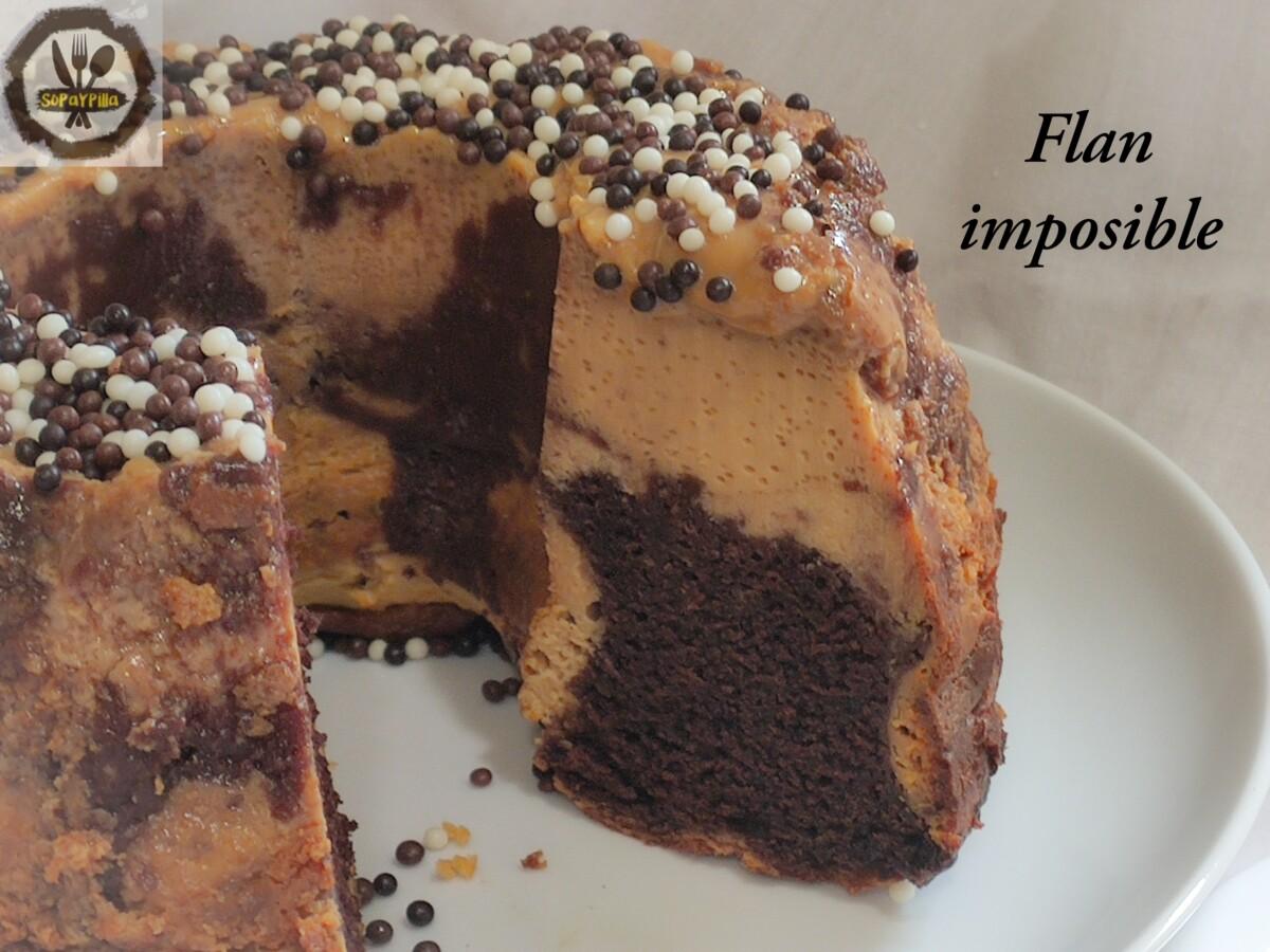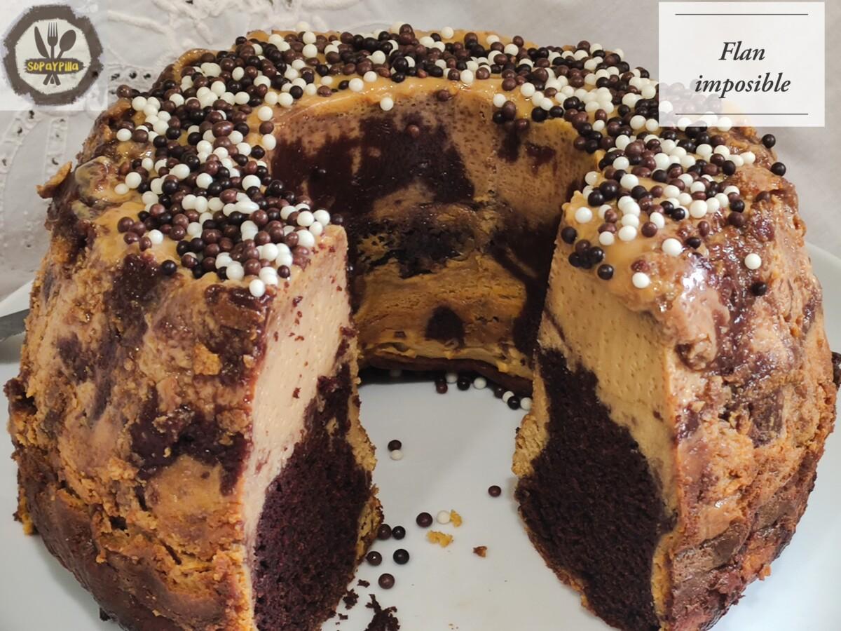 Alguna vez he visto este flan, pastel imposible, chocoflan, pastel mágico, flan imposible…se le llama de muchas maneras, así que cuando vi la receta me lancé directa a por ella. Debo decir que lo que desconocía de este flan (y seguramente de ahí le viene el nombre) es que al hornearlo, las capas se intercambian, y aunque tu has puesto el bizcocho en la base del molde, al desmoldar aparece en la parte inferior del flan…es magia? No! esto es debido a la diferencia de densidades de las dos masas, siendo la de bizcocho mucho más ligera, acaba subiendo a la base del molde. Bueno, no me enrollo más y te explico cómo hacerlo, ya verás que no es nada complicado y el resultado es brutal con el contraste de sabor y textura. Es importante que utilices un molde no desmontable de 23 cm. de diámetro. No lo dejes pasar!!