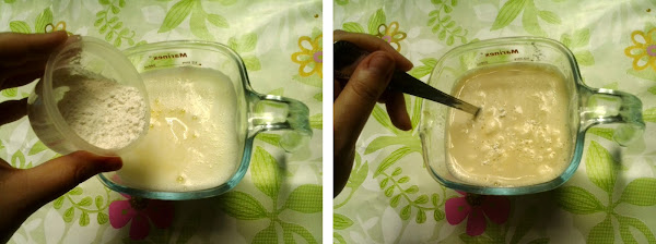 Mientras la mitad hierve, en la otra mitad de la leche disuelve los sobrecitos de cuajada. Añade el edulcorante y las esencias.