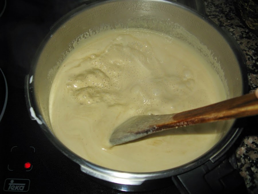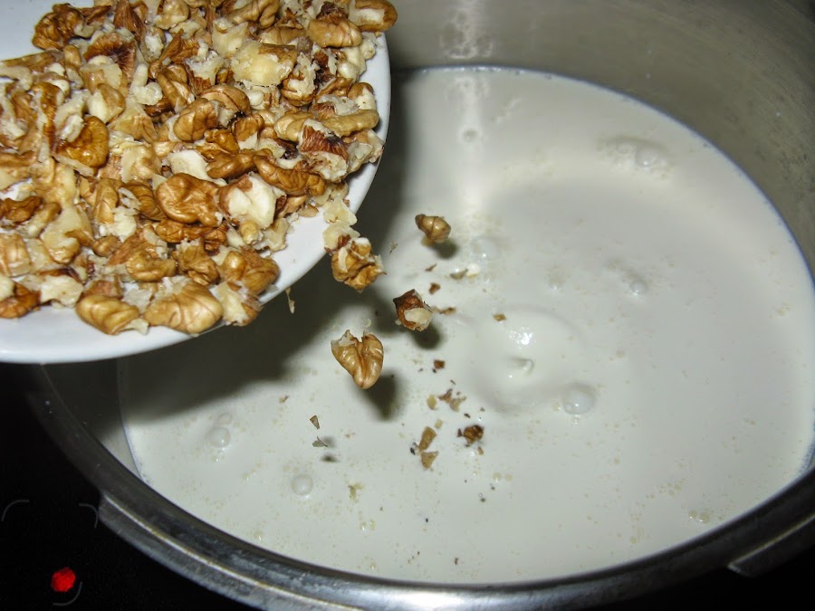 Lo primero ponemos el litro de la nata (crema de leche) a hervir junto con las nueces o lo que echéis, como ya dije "opcional"