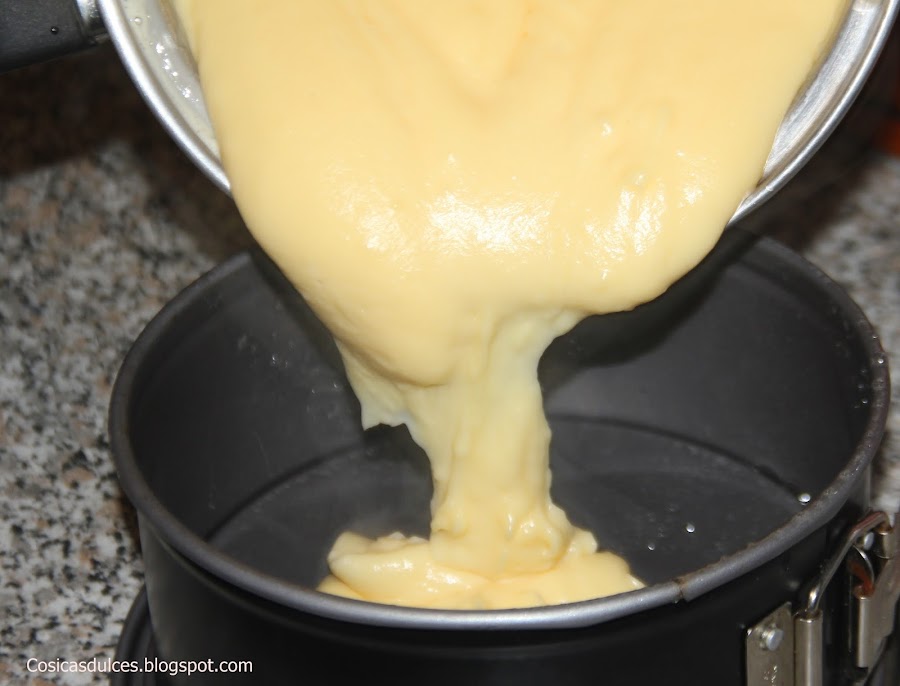 La vertemos en un molde engrasado de 18 centímetros y, cuando esté frío, dejamos reposar como mínimo una hora en la nevera.