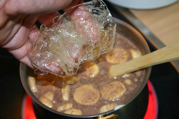 echamos las laminas en agua 5 min para que se hidraten, una vez hidartadas, las escurimos y las agregamos a la cazuela que ya no estara hierviendo por que habremos retirado del fuego, la movemos bien para que se deshaga