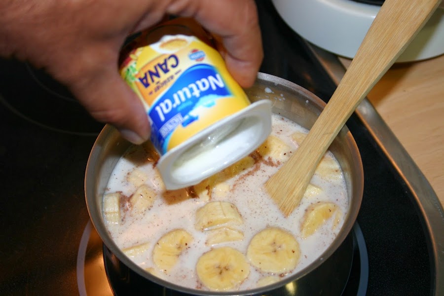 y el yogurt natural con azucar de caña ( o el que sea) y lo movemos todo bien durante la coccion, una vez todo bien ligado, retiramos del fuego y...