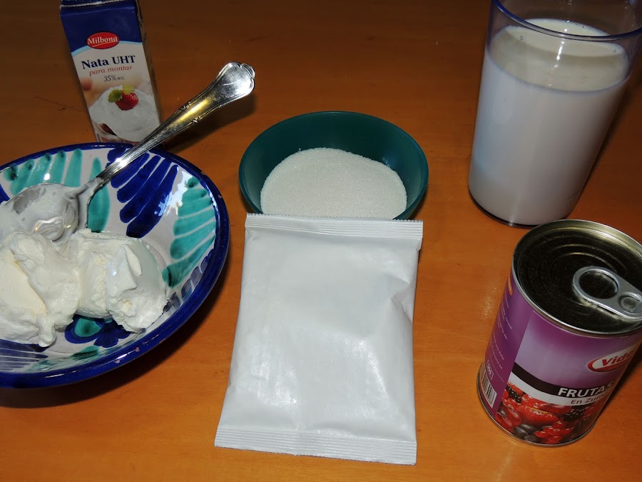 200 gr. de queso de untar, 200 ml. de nata (crema de leche) para montar,500 ml. de leche, un sobre de gelatina de frambuesa, 100 ml. de azúcar y media lata de frutos rojos en almíbar.