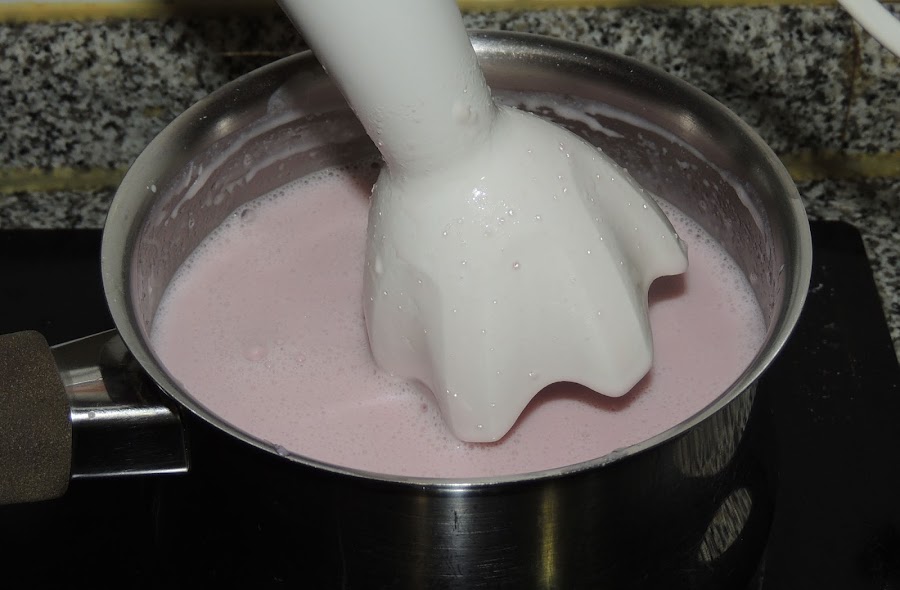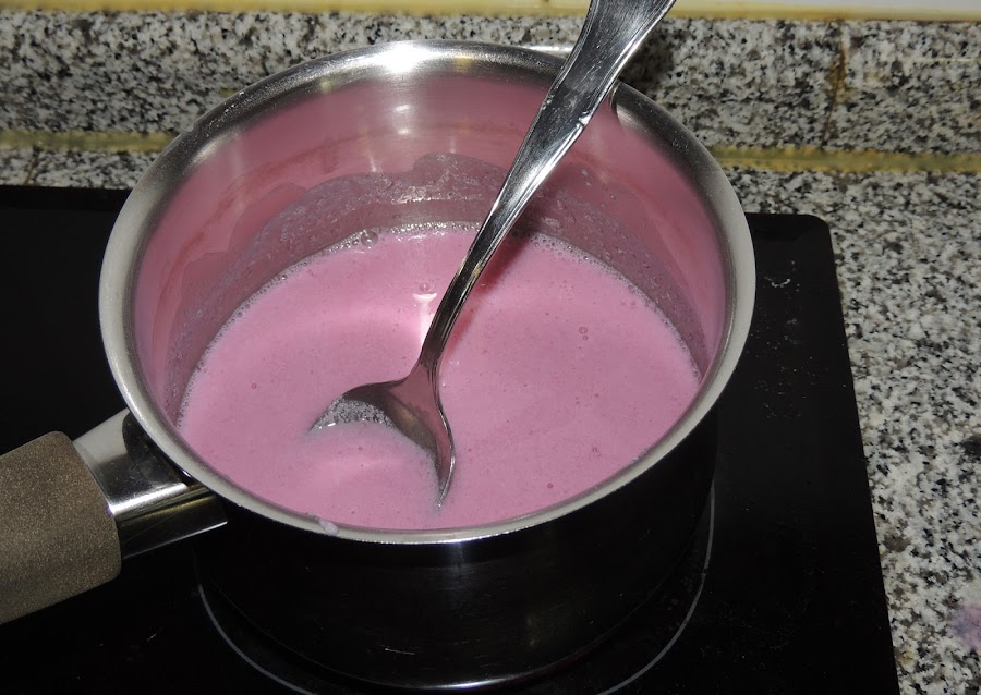 Se agrega el resto de la leche, el queso, el azúcar y la nata (crema de leche). Se bate con la batidora eléctrica si es necesario para que no haya grumos.