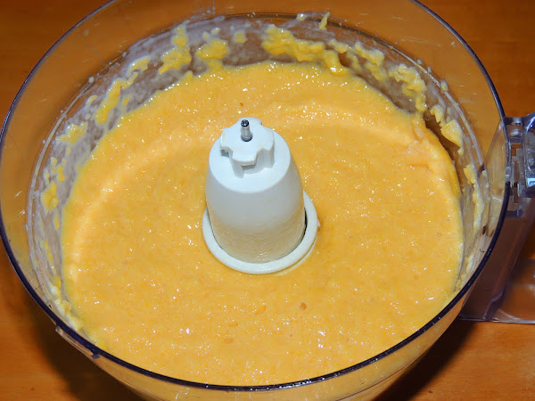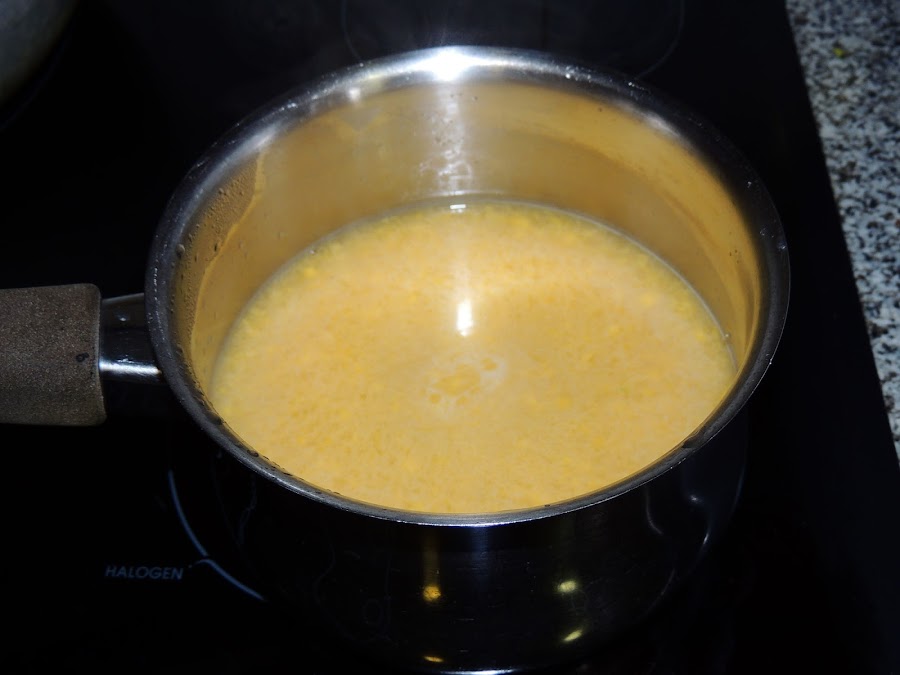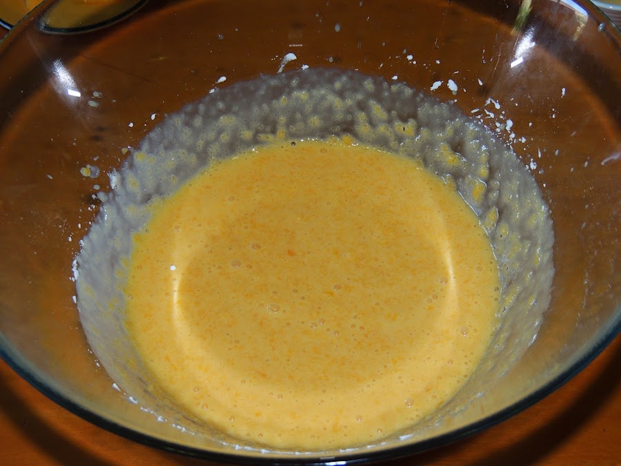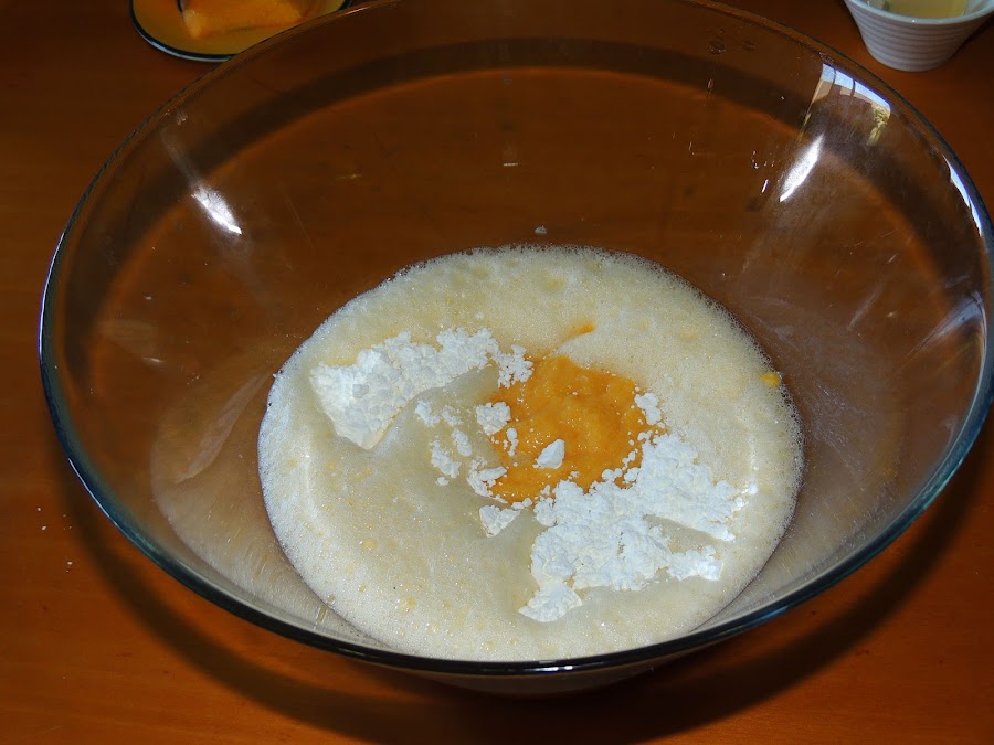 Seguidamente, se baten los huevos y se añade el puré de mango (reservando 4 cucharadas) y la maizena.