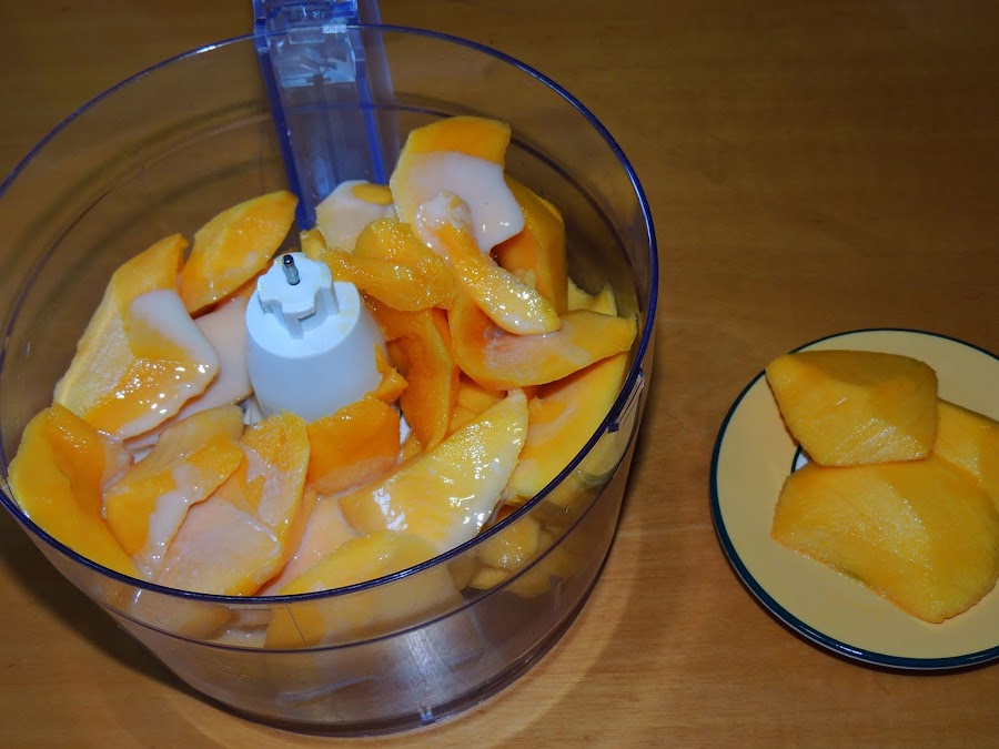 Se pelan los mangos y se cortan a trozos, se pasan por la batidora junto con la leche condensada hasta obtener un puré fino.