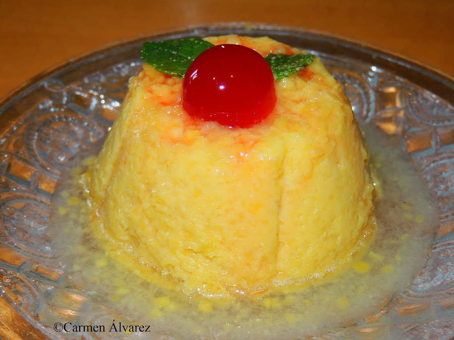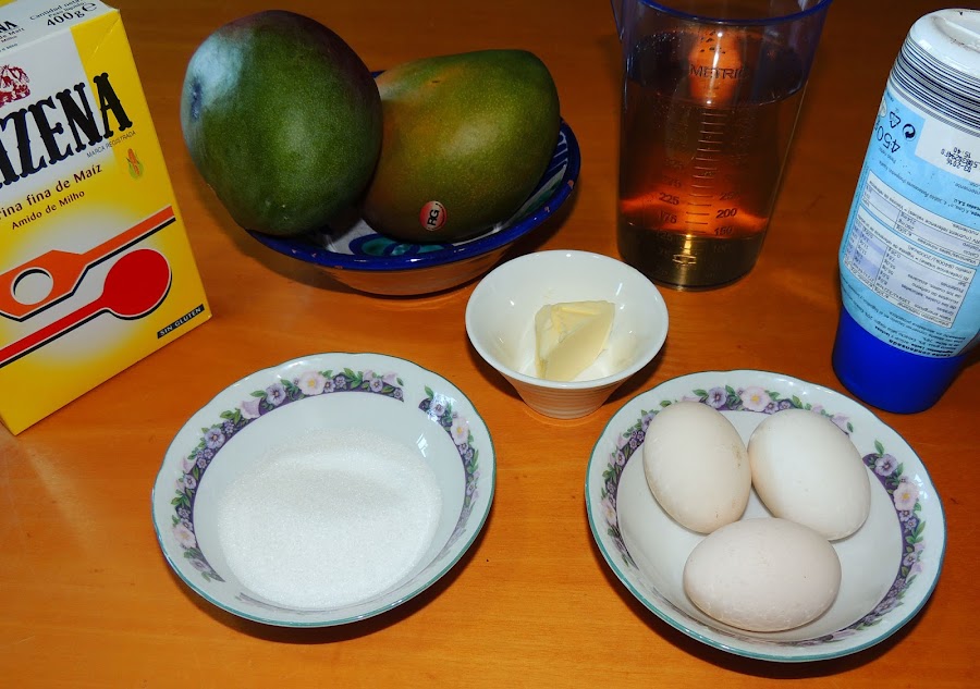 2 mangos maduros, 6 cucharadas de leche condensada, 100 gr. de azúcar, 3 huevos, una cucharada de maizena, 500 ml. de vino dulce (también se puede sustituir por zumo), unas hojitas de menta, 3 guindas y un poco de mantequilla.