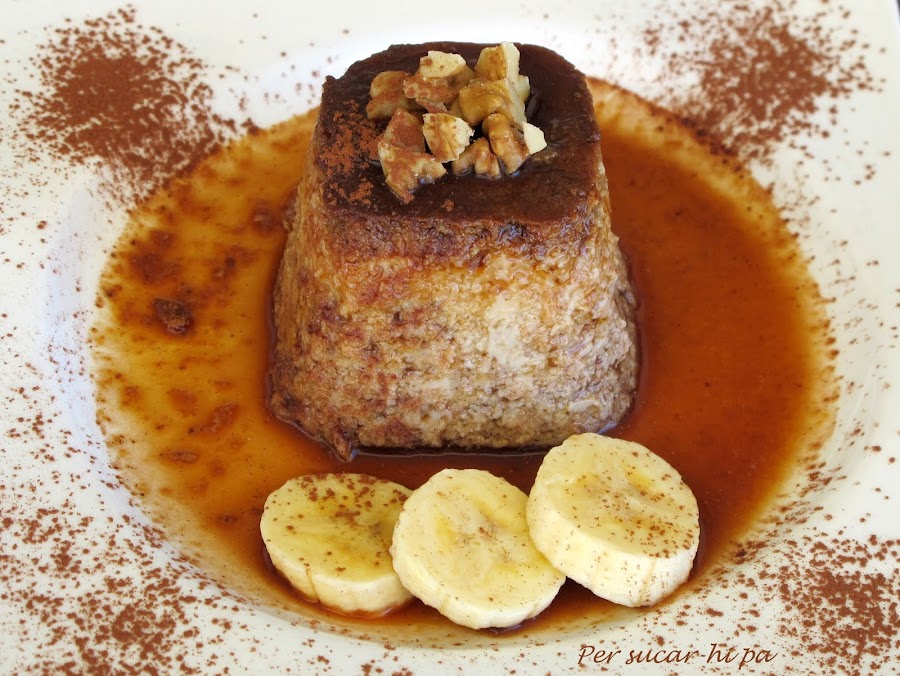 Y si mezclamos frutas y frutos secos? Flan de plátano, nueces y chocolate, suena bien ,la receta en Per sucar Hi-pa.