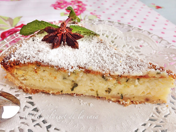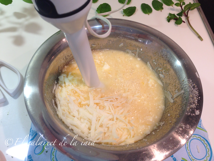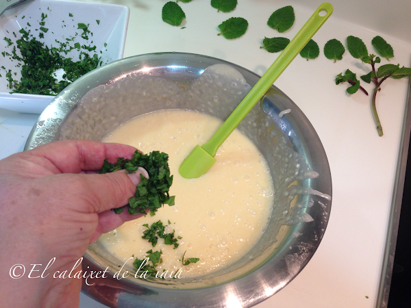 La hierbabuena hay mezclarla con una cuchara o espátula una vez triturado el relleno, si la trituráis junto al resto de ingredientes quedará una masa verdosa que más bien parecerá el increíble Hulk y ése no es el aspecto del Flaó.