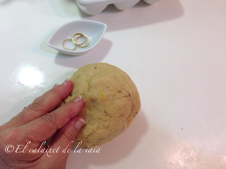 acabamos de amasar a mano y formamos una bola aceitosa pero que no se pega nada, y tenemos dos opciones, podemos ponerla entres dos papeles sulfurizados o bien film amasarla y colocarla en la molde ya estirada o hacerlo directamente sobre el molde estirando la bola