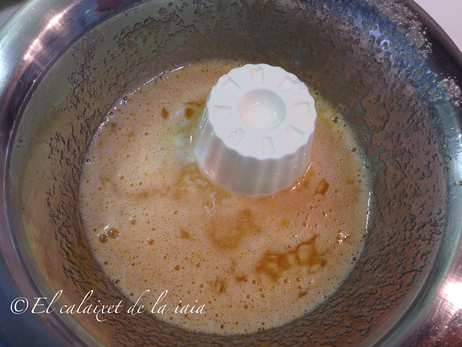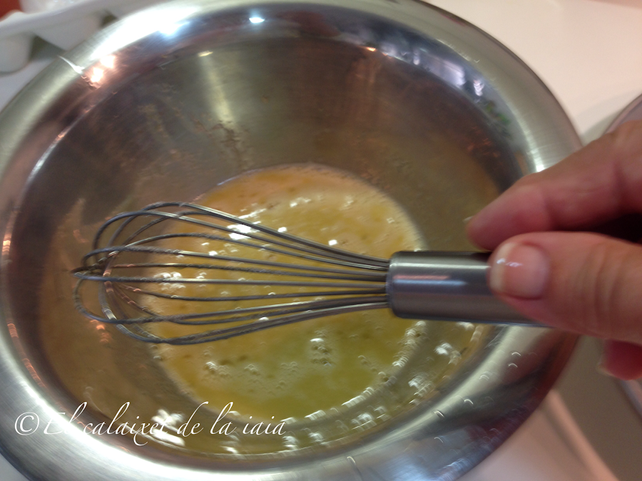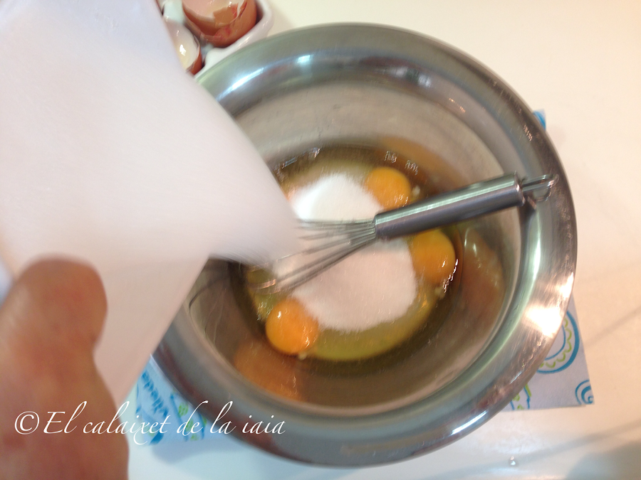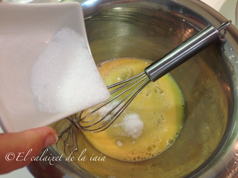 comenzamos a preparar lo que será el relleno del Fláo, para ello mezclamos los cuatro huevos con 200g de azúcar y batimos