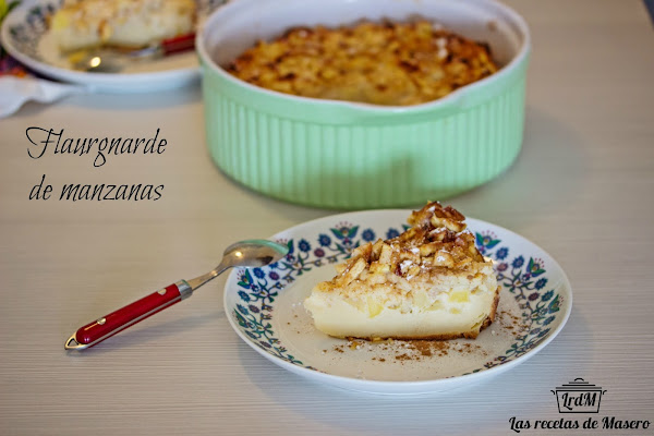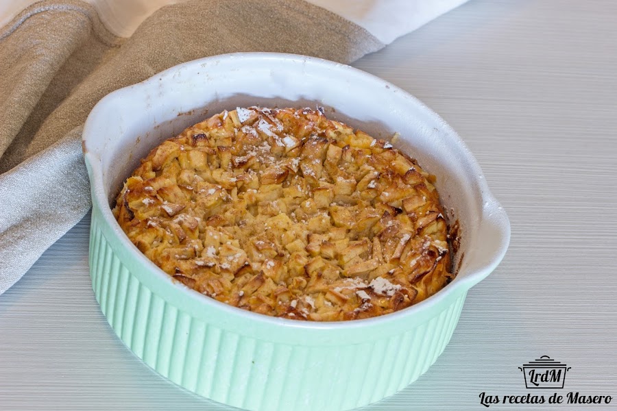 Añadimos en la base del molde previamente untado con mantequilla ( que no sea desmontable) la mitad de la manzana en trocitos, vertemos la masa encima y añadimos el resto de la manzana que habíamos reservado.