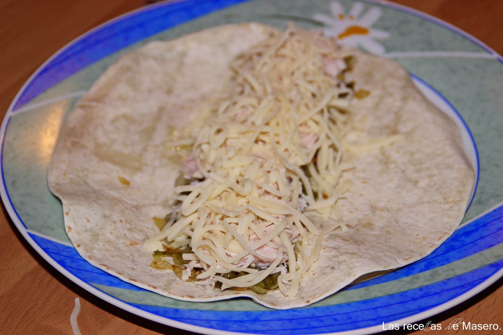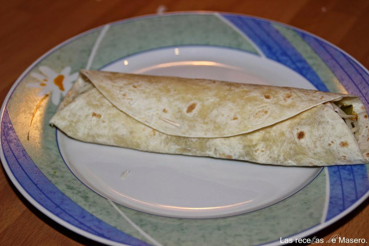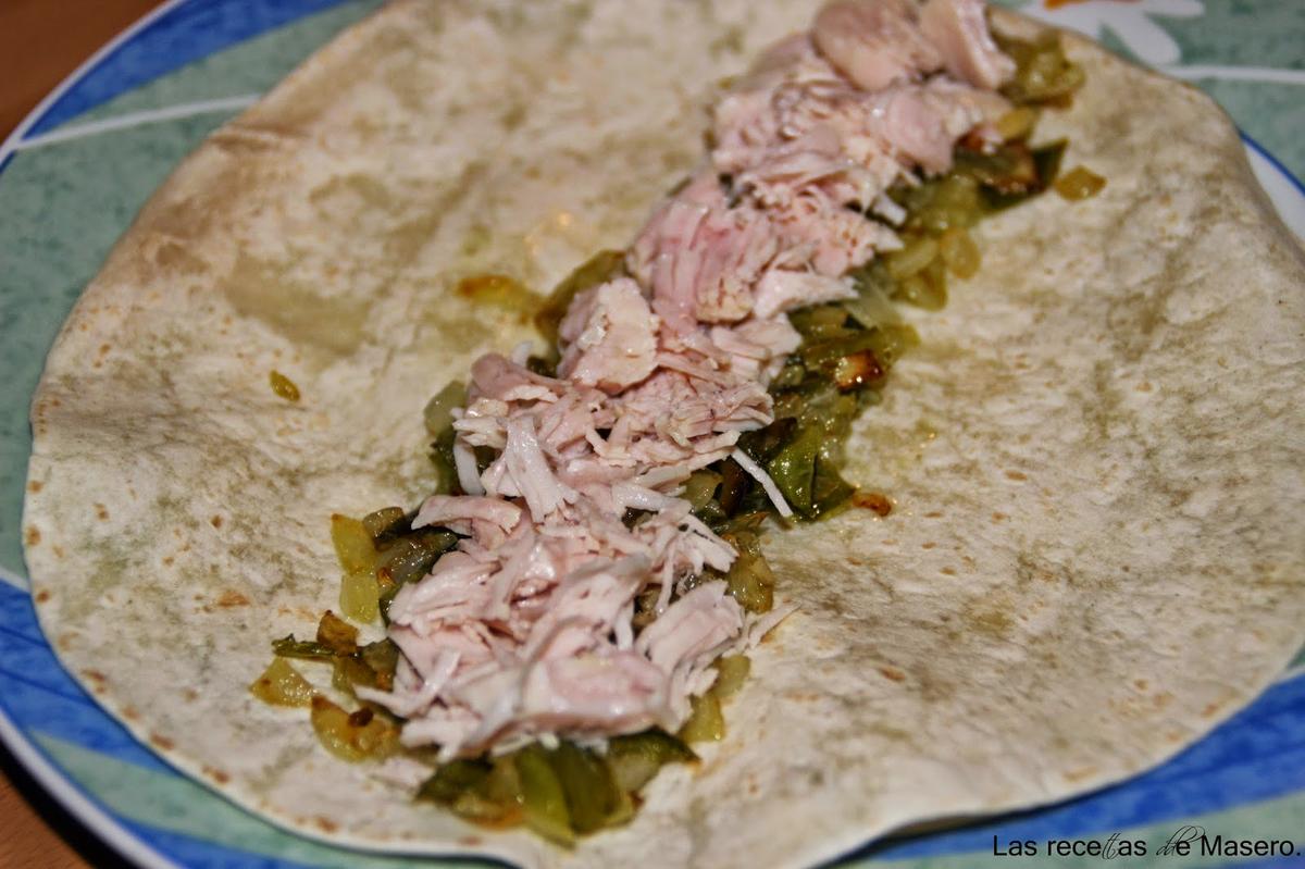 En este caso hemos hecho una flauta, pero con la tortilla de maíz bien podríais hacer una quesadilla como esta (ver receta aquí). Para el relleno hemos hecho un sofrito muy sencillo, con pechuga de pollo en conserva de Casa Matachín (en aceite), que es muy suave y hace buen contraste con el pimiento. Podéis agregarle tomate frito, eso es a gusto del consumidor.