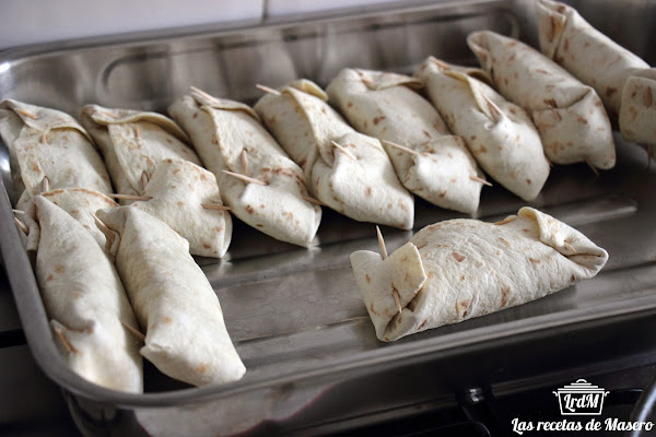 Hacemos el paquetito y lo cerramos con unos palillos.Vamos colocando en una bandeja.