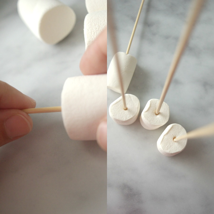 Pinchamos las brochetas en el centro de las nubes. Reservamos.