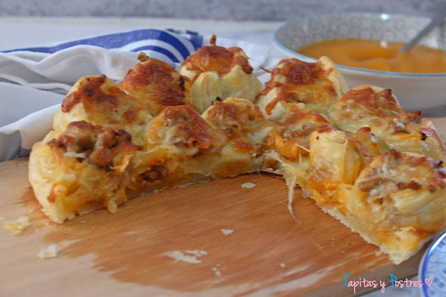Hoy traigo una salada, una tarta de carne que vi en una revista y que llamaban "flor de carne". Yo he tuneado un poco la receta y los ingredientes añadiendo queso pero la esencia del plato es tal y como la veis. Una especie de tarta de rulos rellenos de carne picada en salsa.