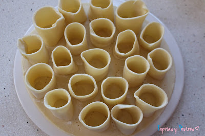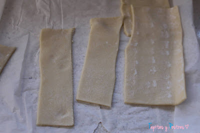 Hacemos tiras con la otra lámina de hojaldre de un tamaño aproximado de 12 o 15 cm de largo y tres de ancho. Aproximadamente...