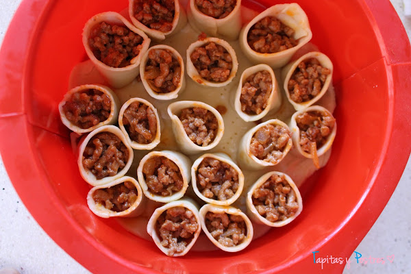Rellenamos cada rollito con la carne guisada. En mi caso, le puse al molde sus paredes de silicona. Si usais un molde desmoldable de acero, ponedlo con cuidado.