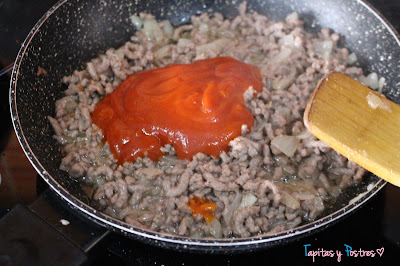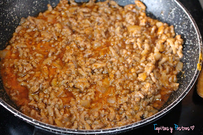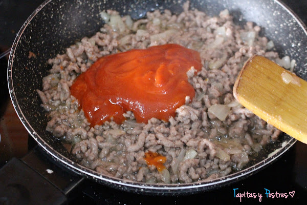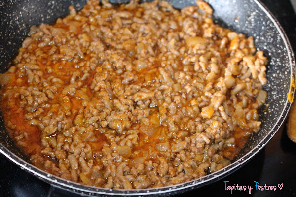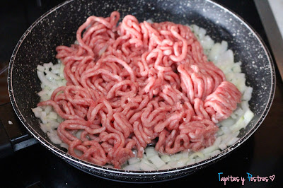 Agregamos la carne picada y sazonamos. Cocinamos hasta que esté hecha.