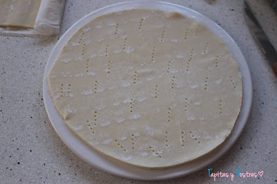 Cortamos una de láminas de hojaldre de modo que cubra el fondo del molde donde vamos a hornear el plato. Mi molde tiene un fondo de cerámica y mide 18 cm. Lo pinchamos para que no suba.
