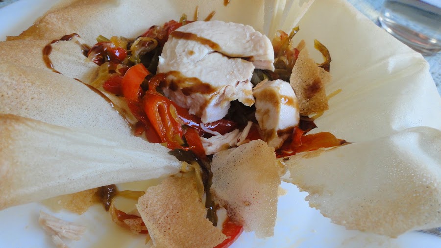 Una vez templada y ya fuera del horno la rellenamos, le colocamos los pimentos, encima el pollo y decoramos con un toque de crema de vinagre.