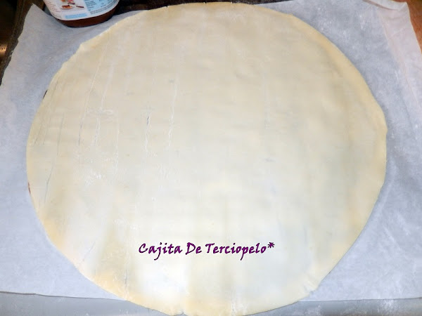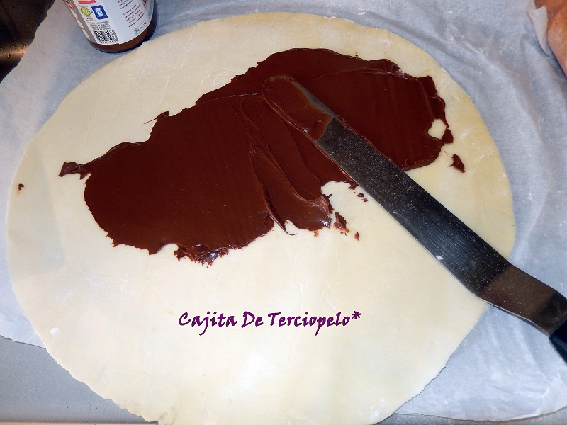Empezamos a extender la Nutella sin llegar al borde. No pongáis una capa gruesa, sino, al irse calentando en el horno, se saldrá toda, ha de ser una capa finita,de 1/2 cm o menos.
