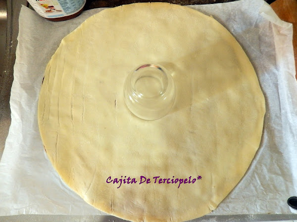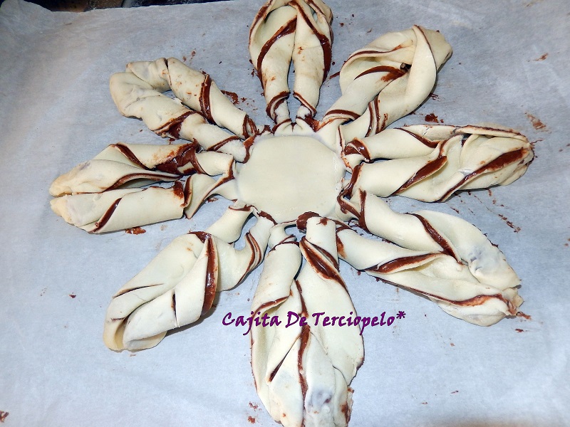 Lo mejor es encontrar el hojaldre en planchas redondas, ya que también se puede hacer con planchas cuadradas pero que sean grandes y con un plato grande puesto boca abajo, cortar la forma. Lo que no os aconsejo es que estiréis mucho la masa, pues entonces el hojaldre no subirá tanto y lo bueno de esta flor es notar el crujiente del hojaldre. Muy importante que la Nutella y el hojaldre estén a temperatura ambiente para manejarlo mejor. Ahí os va la receta.