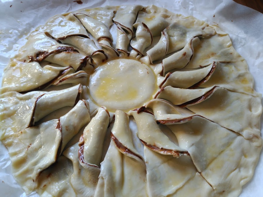 - Unimos todos los bordes, para que no queden separados al hornear (igual que antes, presionando con los deditos) y pintamos toda la superficie con huevo batido.