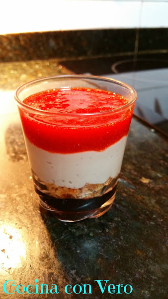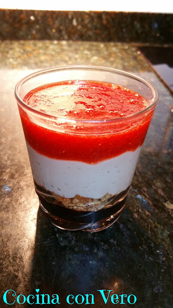 5/ Cogemos los vasos con el chocolate que ya teníamos y les agregamos una base de avellanas, el batido de plátano y por último la crema de fresas.