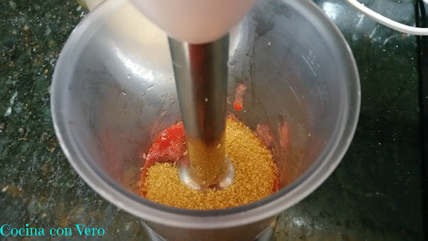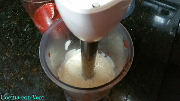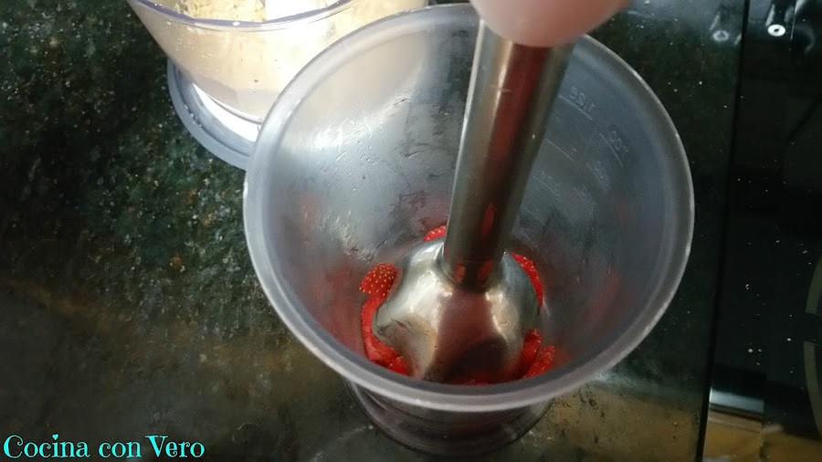 3/ Troceamos las fresas, las pasamos al vaso batidor y las trituramos completamente, aquí debemos decidir cómo de dulce sea el postre, yo añadí 2 cucharadas de azúcar grandes.